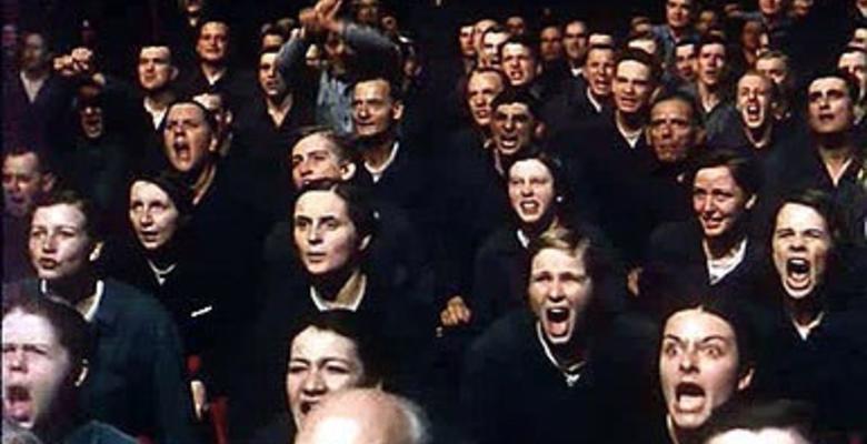 Before the Hate had proceeded for thirty seconds, uncontrollable exclamations of rage were breaking out from half the people in the room […] In its second minute the Hate rose to a frenzy. People were leaping up and down in their places and shouting at the tops of their voices in an effort to drown the maddening bleating voice […] The dark-haired girl behind Winston had begun crying out ‘Swine! Swine! Swine!’ and suddenly she picked up a heavy Newspeak dictionary and flung it at the screen.