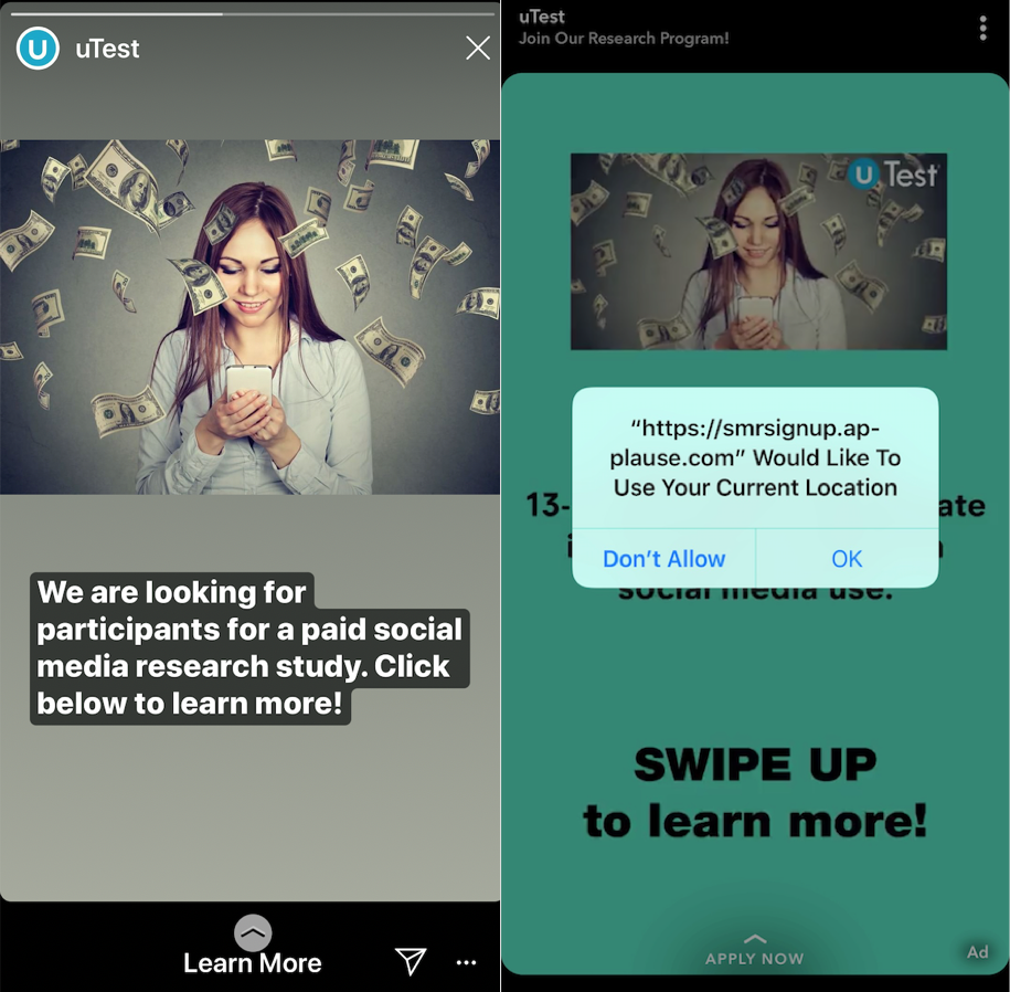 Ads (shown below) for the program run by uTest on Instagram and Snapchat sought teens 13-17 years old for a “paid social media research study.” The sign-up page for the Facebook Research program administered by Applause doesn’t mention Facebook, but seeks users “Age: 13-35 (parental consent required for ages 13-17).” If minors try to sign-up, they’re asked to get their parents’ permission with a form that reveal’s Facebook’s involvement and says “There are no known risks associated with the project, however you acknowledge that the inherent nature of the project involves the tracking of personal information via your child’s use of apps. You will be compensated by Applause for your child’s participation.” For kids short on cash, the payments could coerce them to sell their privacy to Facebook.