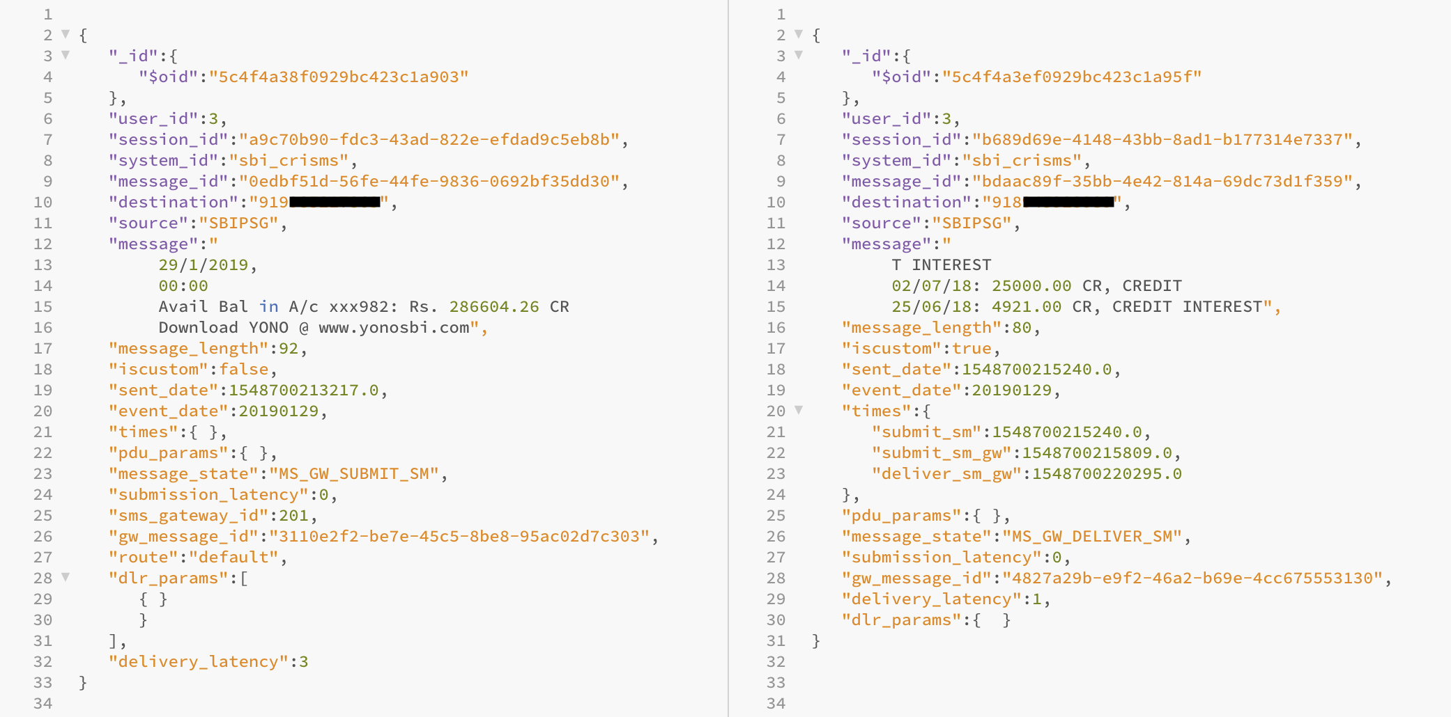 The passwordless database allowed us to see all of the text messages going to customers in real time, including their phone numbers, bank balances and recent transactions. The database also contained the customer’s partial bank account number. Some would say when a check had been cashed, and many of the bank’s sent messages included a link to download SBI’s YONO app for internet banking.