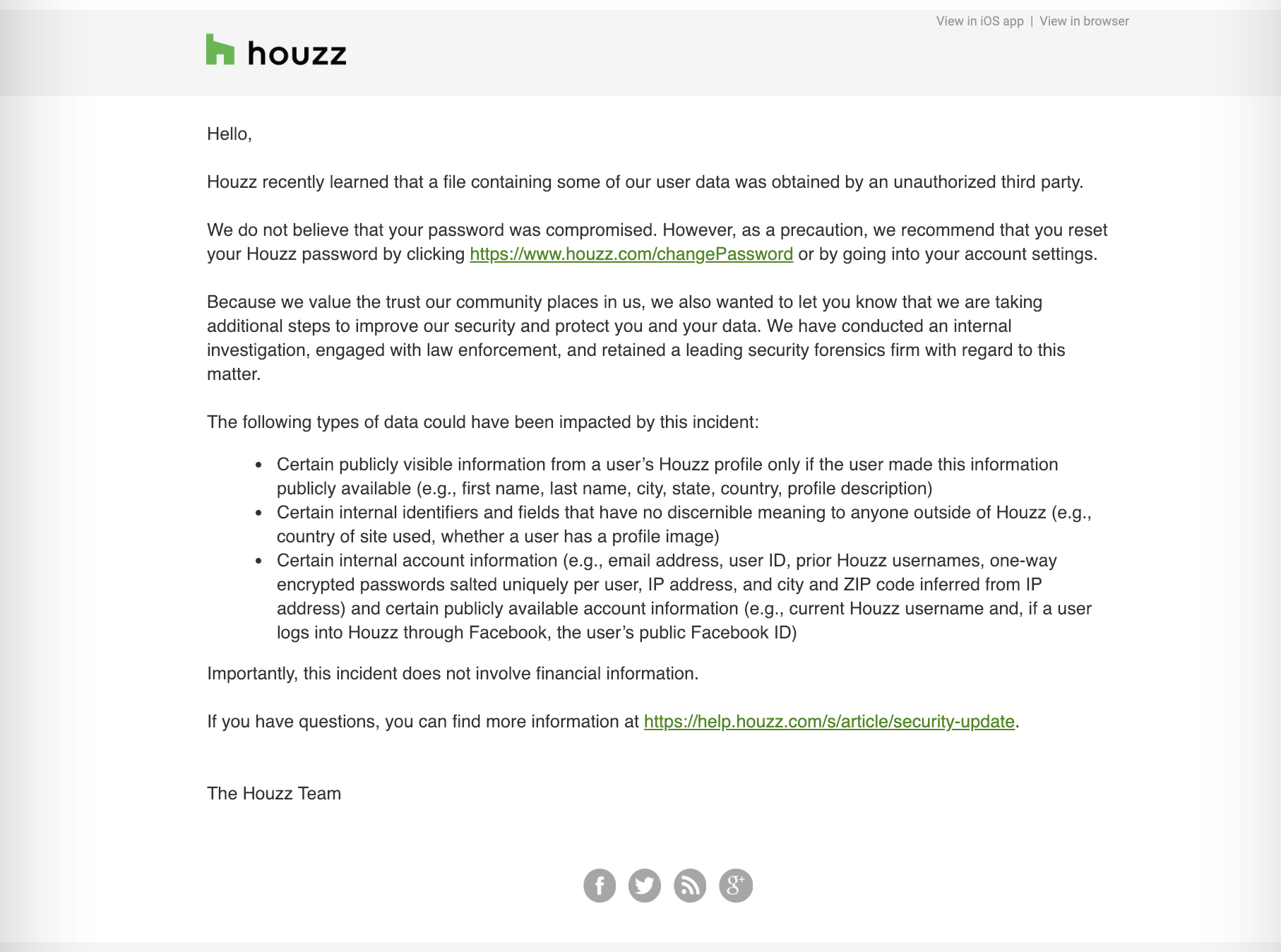 Houzz said some publicly visible information from a user’s Houzz profile could be affected, such as name, city, state, country and profile description, along with internal identifiers and fields “that have no discernible meaning to anyone outside of Houzz,” such as the region and location of the user and if they have a profile image, for example, the company said.