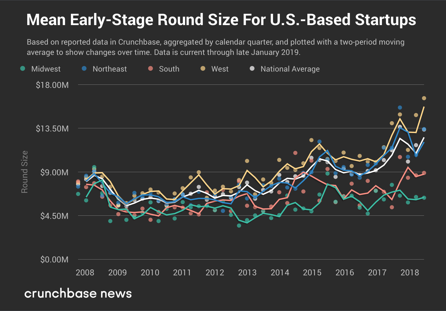 Although the average has certainly crept up, part of that is attributable to a newer trend in companies raising huge sums of money. In the report, we indicated that many of the largest early-stage rounds were raised by companies in the West and Northeast. But startups in these regions don’t hold a monopoly on raising lots of money from venture capitalists.