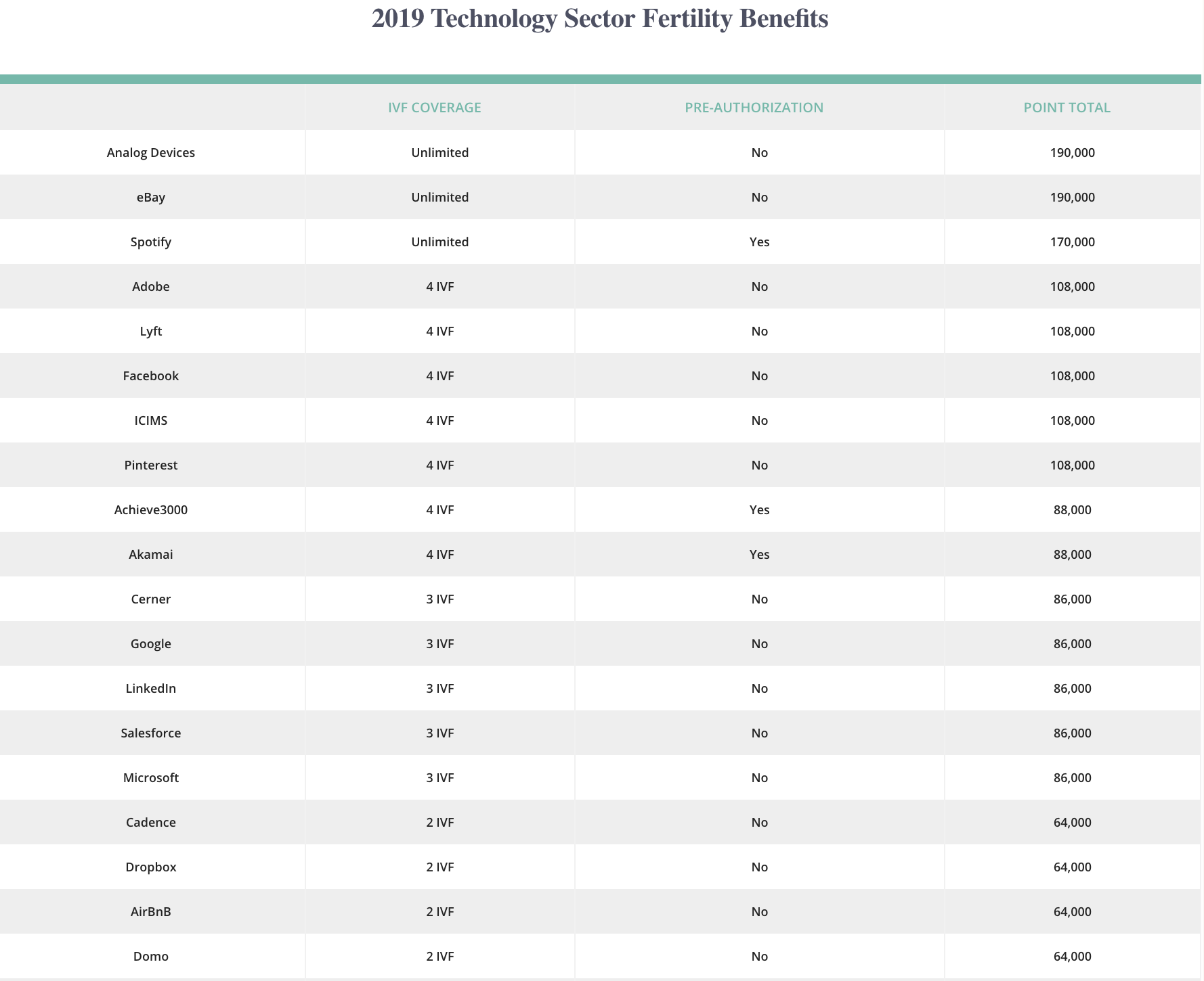 The company asked 30,000 in vitro fertilization (IVF) patients across industries about their employer’s — or their spouse’s employer’s — 2019 fertility treatment policy, and allocated points based on their support for IVF procedures and egg freezing, among other services.