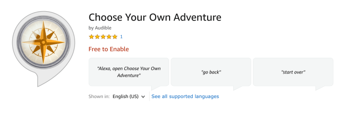 Audible’s new Choose Your Own Adventure stories aren’t the only example of this format coming to audio. In addition to ChooseCo’s own online audio-based games, there’s also a comedy game show that uses the format, and The NYT even tried a choose-your-own-news adventure in 2017. There also are skills for interactive stories that aren’t using the ChooseCo trademark.