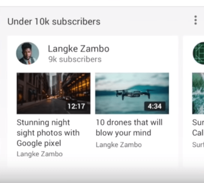 Here, a shelf is shown showcasing creators with fewer than 10,000 subscribers. These suggestions are personalized to you, too, based on which channels you currently like and regularly watch.