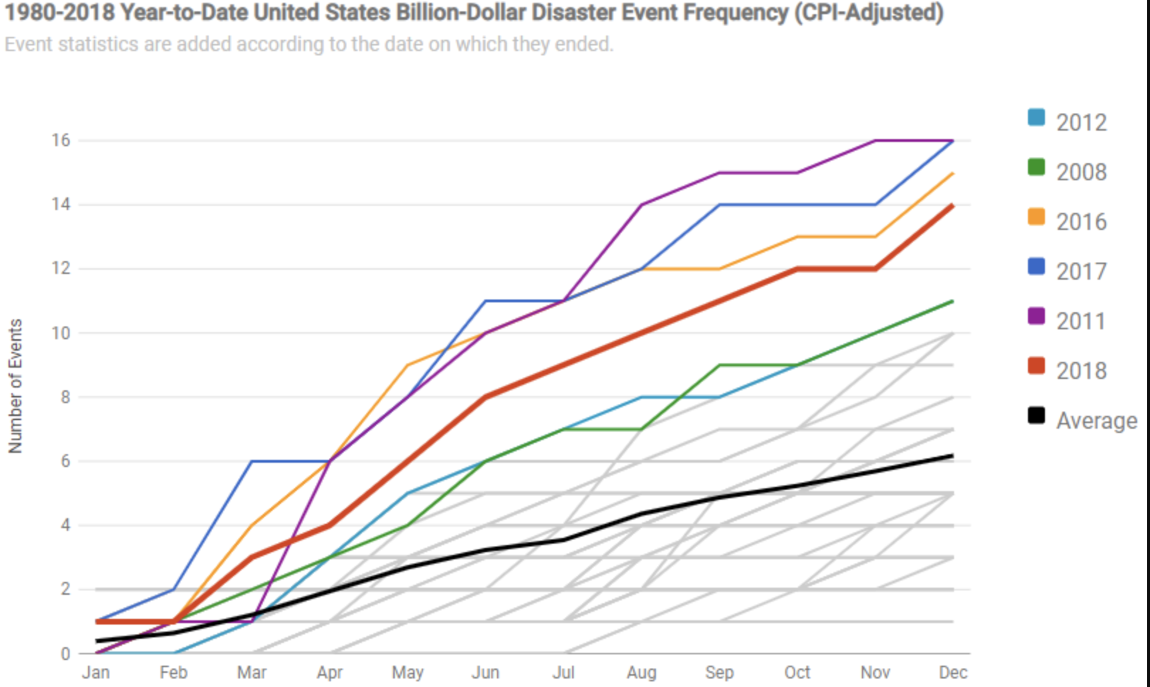 The past three years (2016-2018) have been historic, with the annual average number of billion-dollar disasters being more than double the long-term average. The number and cost of disasters are increasing over time due to a combination of increased exposure, vulnerability, and the fact the climate change is increasing the frequency of some types of extremes that lead to billion-dollar disasters.