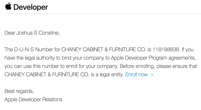 Developers simply have to fill out an online form and pay $299 to Apple, as detailed in this guide from Calvium. The form merely asks developers to pledge they’re building an Enterprise Certificate app for internal employee-only use, that they have the legal authority to register the business, provide a D-U-N-S business ID number and have an up to date Mac. You can easily Google a business’ address details and look up their D-U-N-S ID number with a tool Apple provides. After setting up an Apple ID and agreeing to its terms of service, businesses wait one to four weeks for a phone call from Apple asking them to reconfirm they’ll only distribute apps internally and are authorized to represent their business.