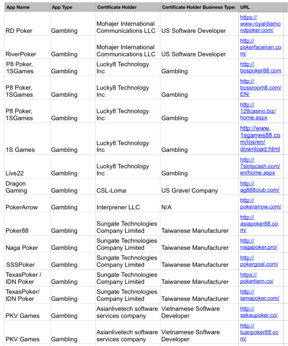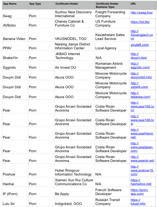 The Enterprise Certificates for these apps were rarely registered to company names related to their true purpose. The only example was Lucky8 for gambling. Many of the apps used innocuous names like Interprener, Mohajer International Communications, Sungate and AsianLiveTech. Yet others seemed to have forged or stolen credentials to sign up under the names of completely unrelated but legitimate businesses. Dragon Gaming was registered to U.S. gravel supplier CSL-LOMA. As for porn apps, PPAV’s certificate is assigned to the Nanjing Jianye District Information Center, Douyin Didi was licensed under Moscow motorcycle company Akura OOO, Chinese app Pear is registered to Grupo Arcavi Sociedad Anonima in Costa Rica and AVBobo covers its tracks with the name of a Fresno-based company called Chaney Cabinet & Furniture Co.