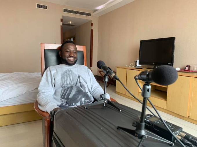 Here’s a photo of upcoming guest Hannibal Buress, recorded in my hotel room in Lagos, Nigeria. My setup is placed gingerly atop my overturned suitcase on a coffee table. He’s clearly impressed.