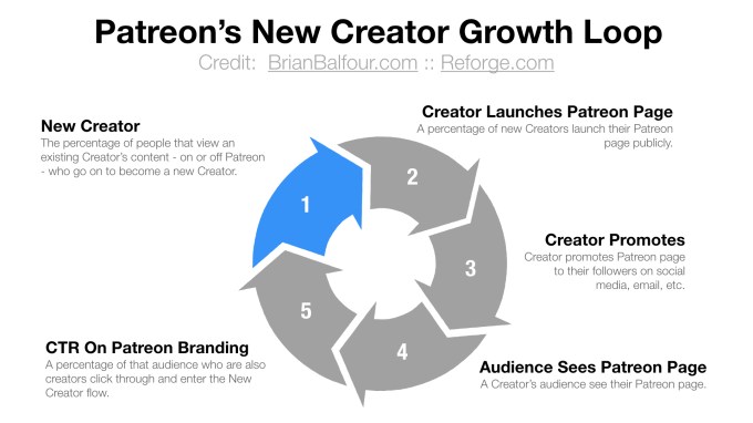 Patreon doesn’t spend money on paid user acquisition campaigns (at least, according to them). New creators are acquired primarily through a viral acquisition loop. Patreon gains new customers (creators) because each one promotes their Patreon to their fan base, and their fans naturally include other creators, some of whom will then join themselves and continue the cycle. It’s very cost efficient to have an acquisition loop more akin to a social networking platform than a traditional SaaS startup.
