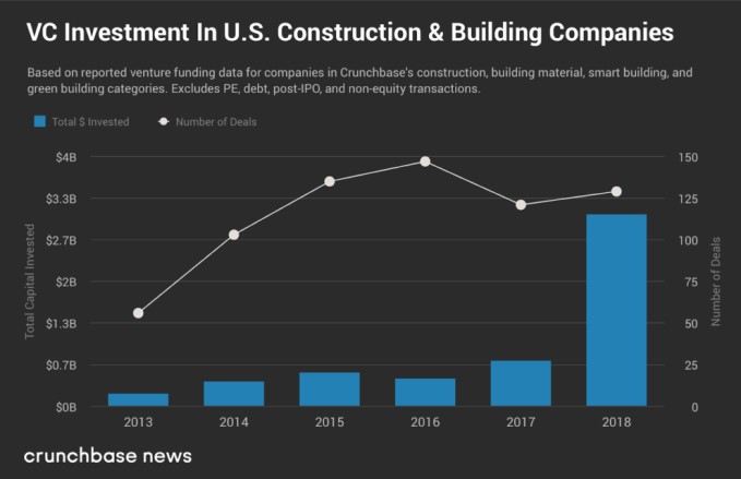 Without those two rounds, the construction tech sector saw just $1.135 billion in funding in 2018, up a more modest 55 percent over 2017’s totals.