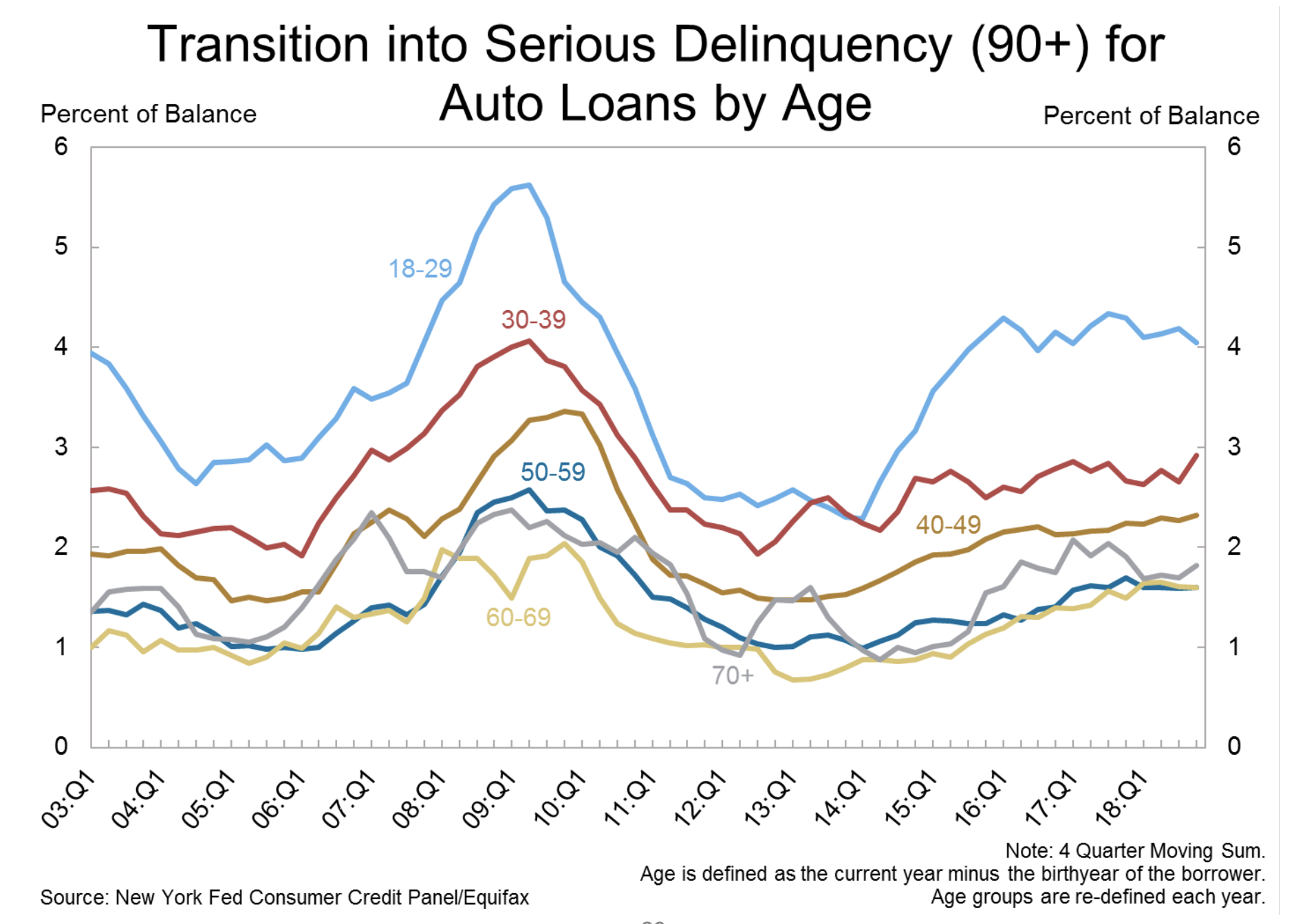 - Rising overall delinquency rates remain below 2010 peak levels. However, there were more than 7 million Americans with auto loans that were 90 or more days delinquent at the end of 2018