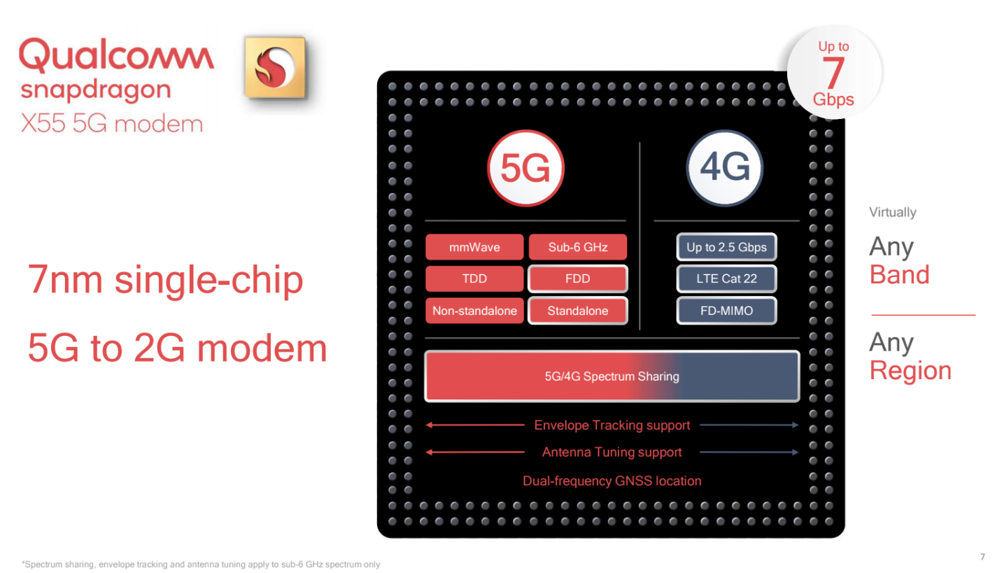 The X55 is the world’s first announced 7 Gbps 5G modem, but what’s maybe more important for your day-to-day usage (once you get a device that uses it) is that it supports every recent technology from 2G to 5G and every spectrum band in any region. It’s a 7nm chip and it has one more important trick up its sleeve: 5g/4G spectrum sharing, which allows operators to support 5G and LTE on the same spectrum.
