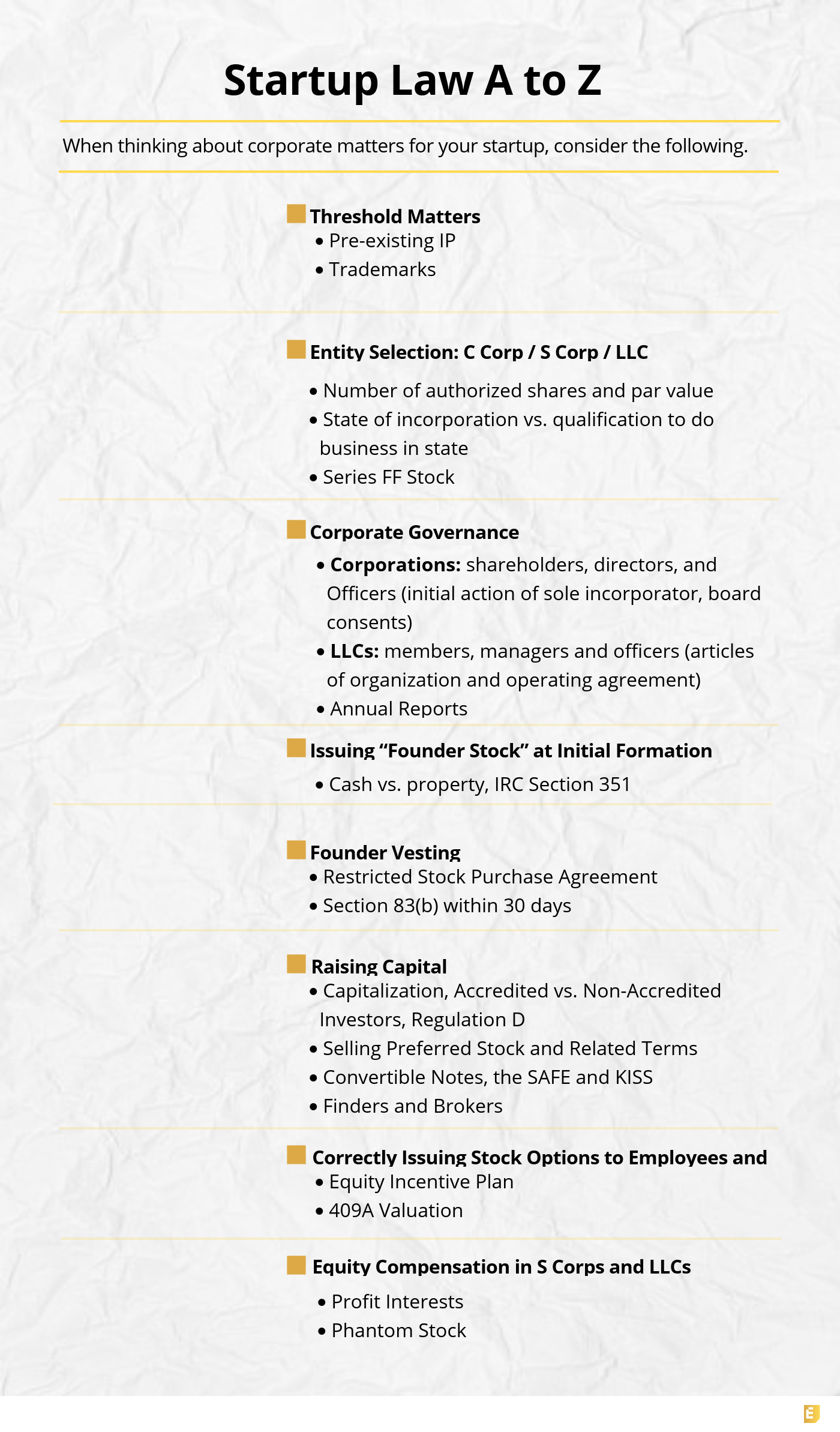 Admittedly, the foregoing covered a bit of ground. As a founder, it is important that you have at least basic familiarity with an incredibly broad range of legal topics — corporate law being one of the most important. Such familiarity will allow you to identify and distinguish between situations that your team can readily handle internally, from those that require outside legal counsel. If you’ve made it this far, a congrats are in order — you are well on your way to startup success.