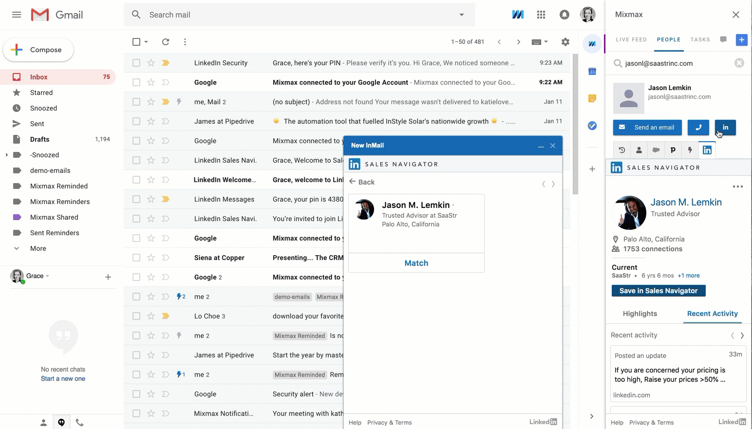What’s more interesting is that the service now features a better integration with LinkedIn. There’s both an integration with the LinkedIn Sales Navigator, LinkedIn’s tool for generating sales leads and contacting them, and LinkedIn’s messaging tools for sending InMail and connection requests — and sees info about a recipient’s LinkedIn profile, including the LinkedIn Icebreakers section — right from the Mixmax interface.