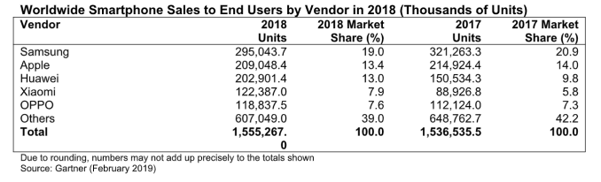 Gartner’s smartphone market share data for the just gone holiday quarter highlights the challenge for device makers going into the world’s biggest mobile trade show, which kicks off in Barcelona next week: The analyst’s data shows global smartphone sales stalled in Q4 2018, with growth of just 0.1 percent over 2017’s holiday quarter, and 408.4 million units shipped.