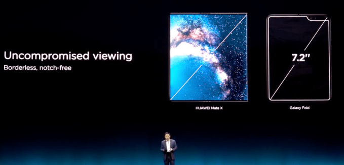 More impressive is what the company’s been able to do with its displays. The screen is very much the thing on these products, and yet the Fold’s outside screen only measures 4.6 inches. The Mate X, meanwhile, sports a pair of outward-facing displays, the larger of which measures 6.6 inches at 2480 x 1148 pixels, with a 19:5 aspect ration.