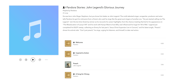 In an effort to one-up Spotify and Apple Music, Pandora this morning announced the launch of a new marketing tool for artists, called Pandora Stories. The feature allows artists to build music playlists combined with voice tracks, where they can add a narrative and deeper insights — explaining, for example, what a song means for them, what inspired their music, the story behind the music or anything else they want to add. When listeners play these Pandora Stories playlists, they get to hear both the music and the storytelling, interspersed.