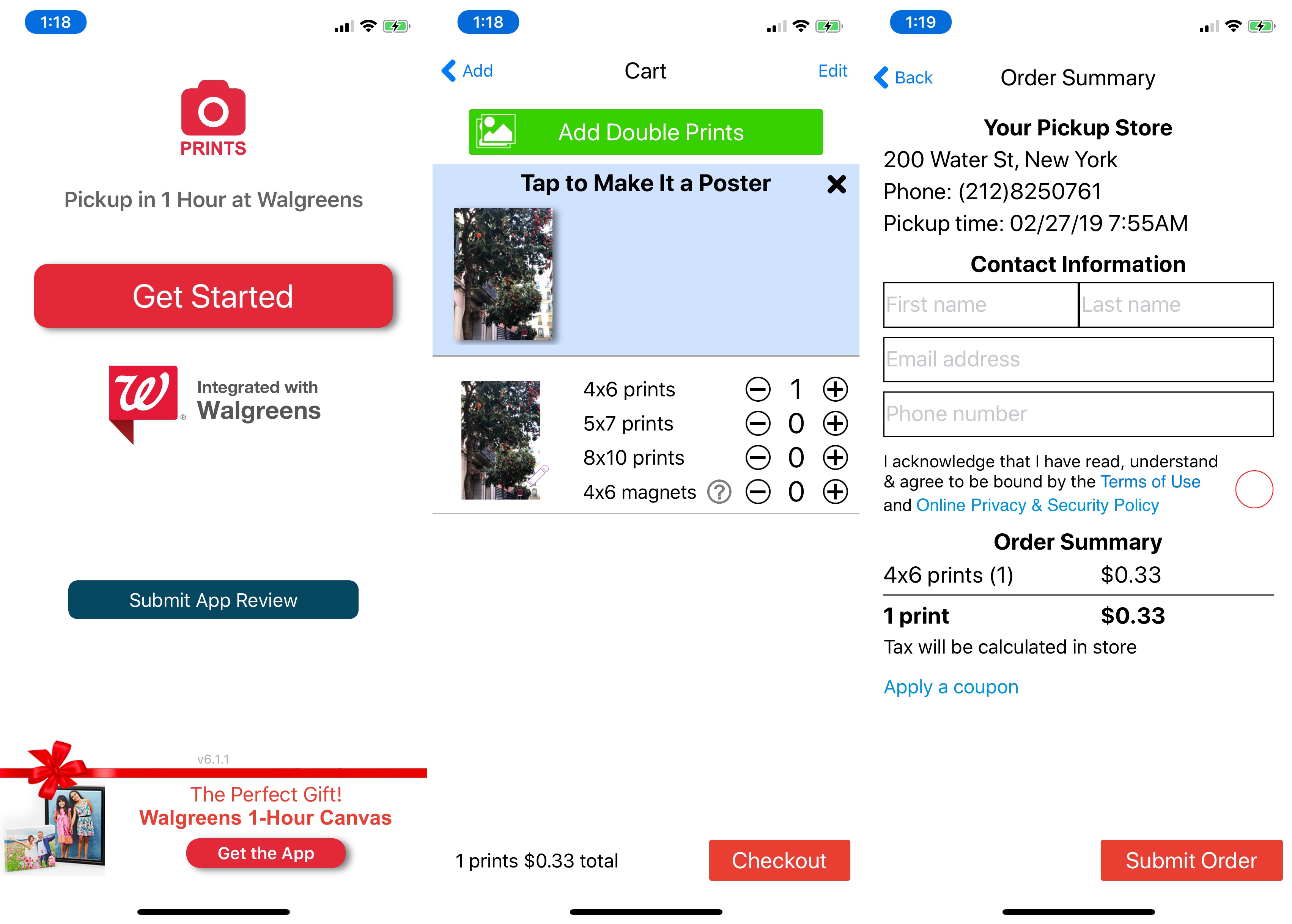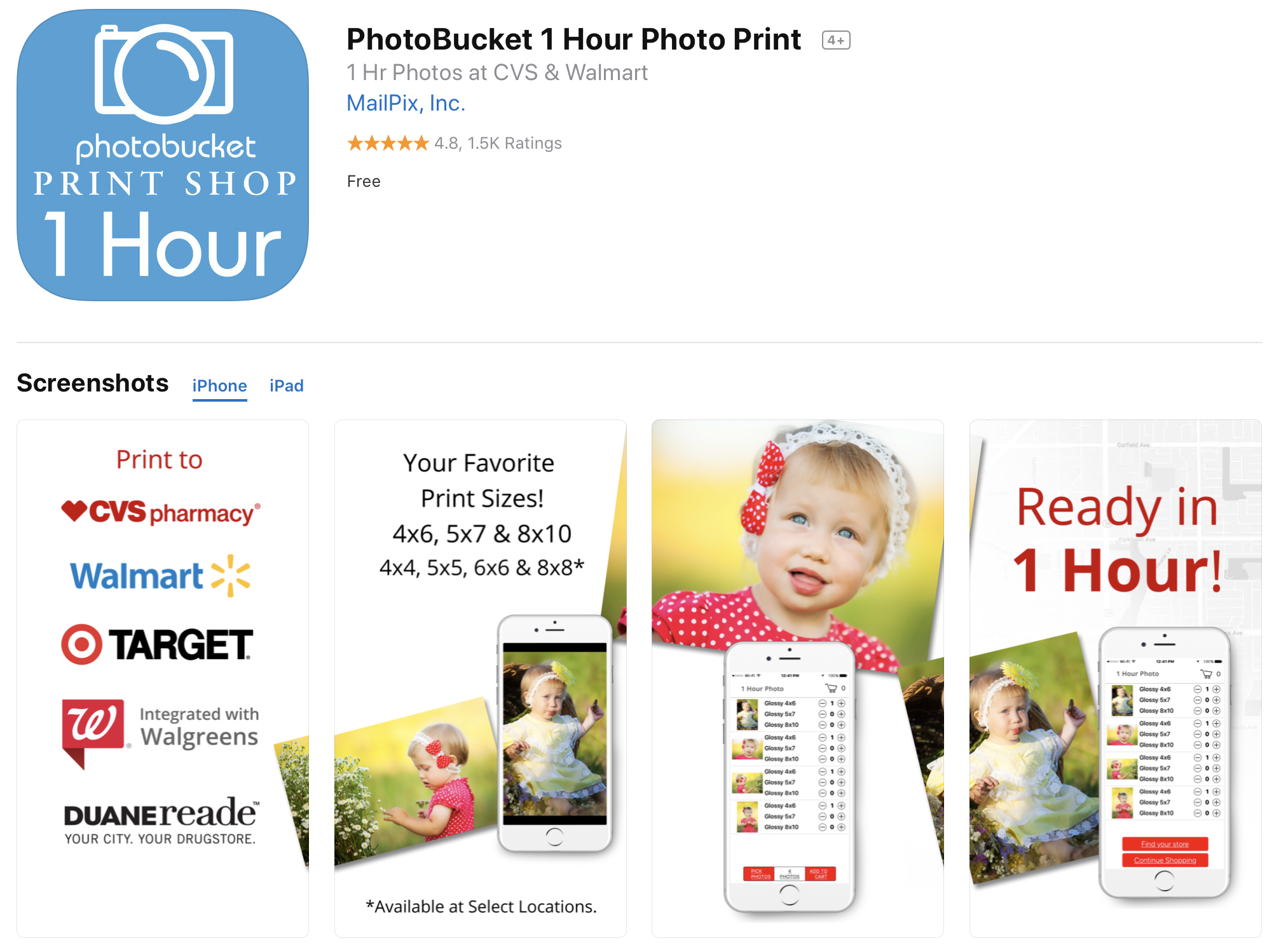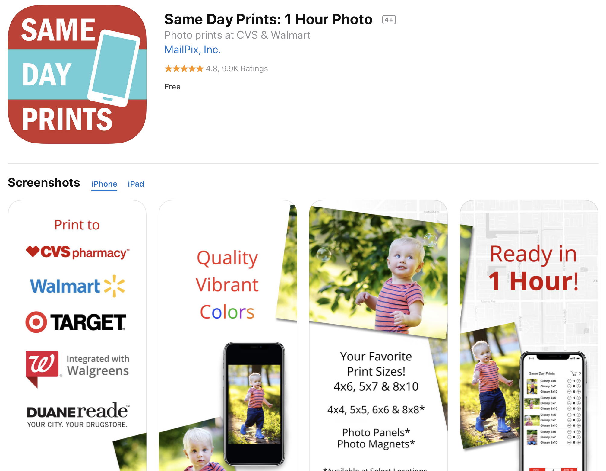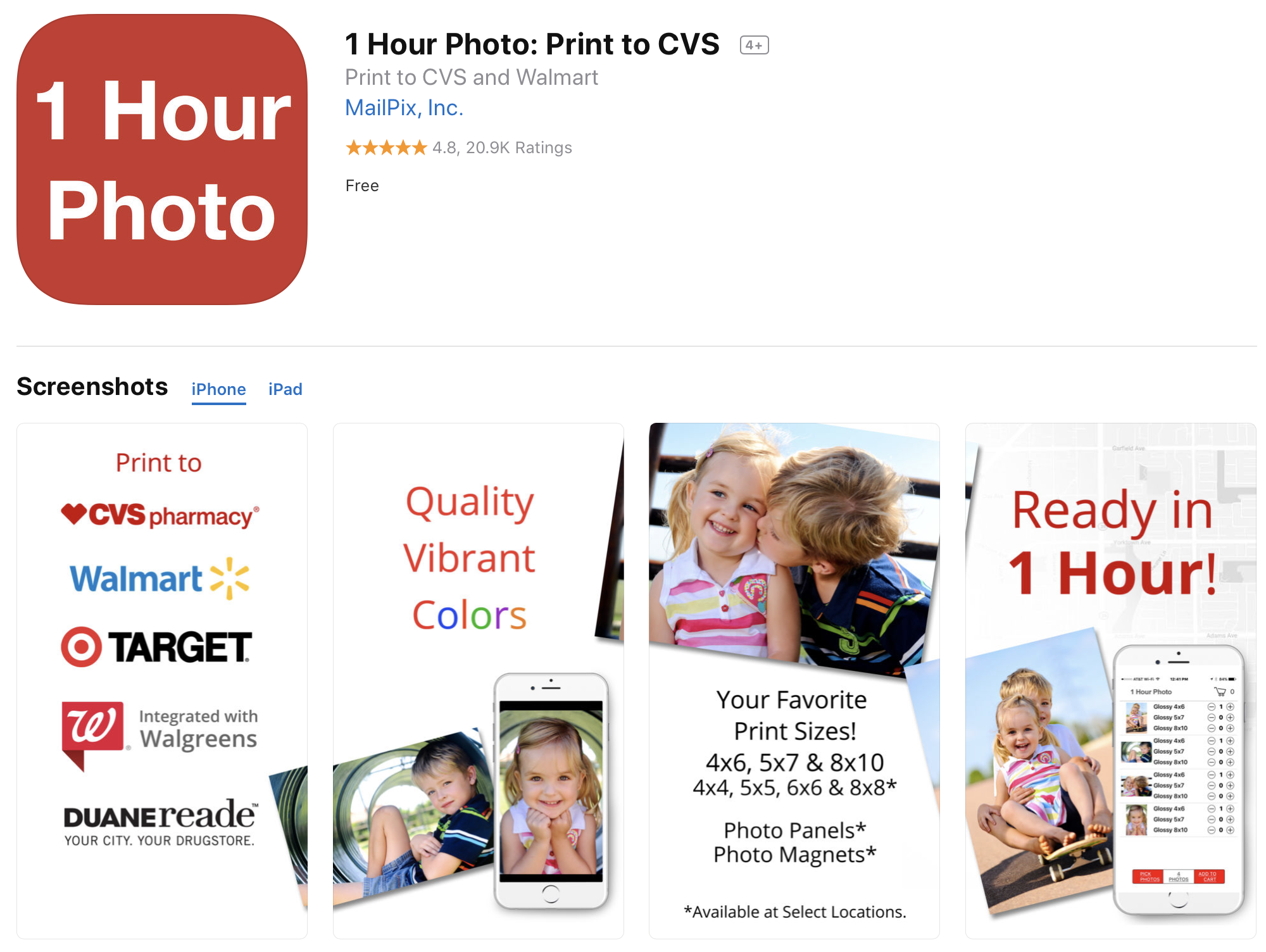 JPEG Labs has released four different apps that let you print photos in Walgreens or CVS stores around you. They all do the same thing but have different names and keywords. (They also tell you to leave a review right after opening the app.)