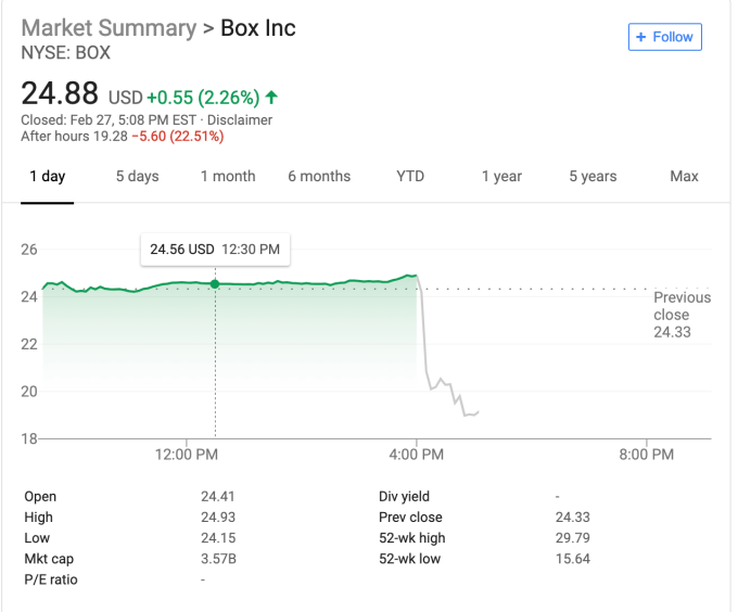 “Box did miss its estimates and got dinged pretty hard today; however, the bigger picture is still of solid growth. As Box moves more and more into the enterprise space, the deal cycle takes longer to close and I think that has played a large part in this shift. The onus is on Box to close those bigger deals over the next couple of quarters, but if it does, then that will be a real warning shot to the legacy enterprise vendors as Box starts taking a chunk out of their addressable market,” Pelz-Sharpe told TechCrunch.