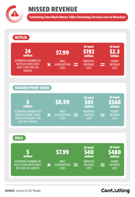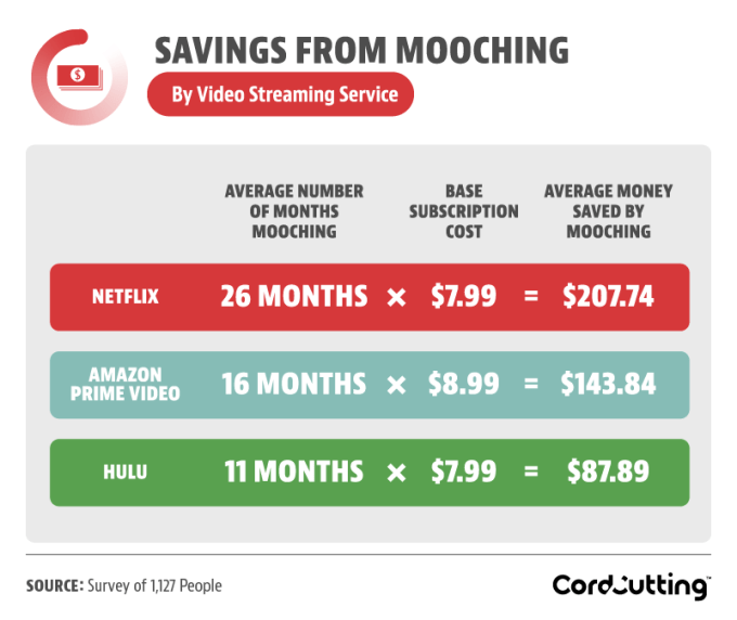 It’s worth noting, too, this study calculated figures by looking at Netflix’s single-screen-at-a-time account — in theory, the one meant to be used by a single individual and not shared as a family plan, in order to keep the estimates conservative. The consumer survey defined mooching by asking users if they use a service they don’t pay for, then asked what they would or would not pay for themselves, if that access fell through.