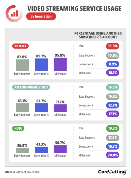 Millennials, not surprisingly, account for much of the freeloading. They’re the largest demographic pirating Netflix (18 percent) and Hulu’s service (20 percent). But oddly, it was Baby Boomers who were more likely to borrow someone else’s account to access Amazon Prime Video.