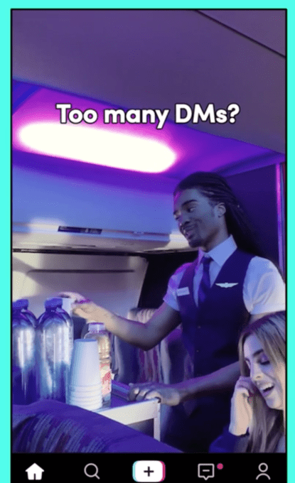 “Too many DMs?,” the video asks. The flight attendant snaps his fingers, which causes most of the passengers to disappear. The scene returns to peace and quiet. It’s a simple enough analogy for TikTok’s younger user base to understand.