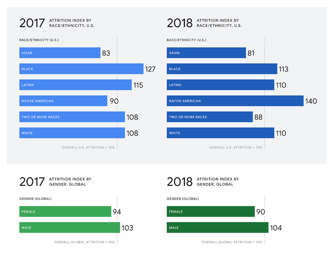Google released its first attrition index last year to show how many employees left the company on an annual basis. Based on last year’s data, it was clear Google had the hardest time retaining black and brown employees. In fact, black and brown people were leaving Google at rates faster than the national average.