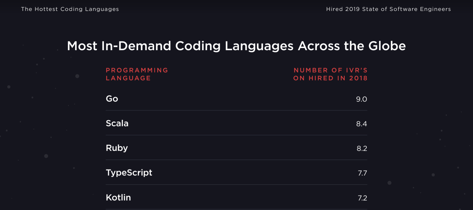 Other languages, like Scala, Ruby, Typescript and Kotlin are also highly valued by employers but have lower penetration rates among the developer community. Globally, Go is the most popular programming language that employers are looking for, while in San Francisco and Toronto there’s higher demand for Typescript experience, the Hired report indicated.