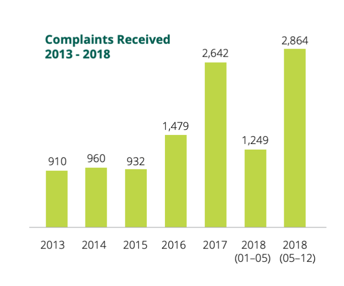 That makes a total of 4,113 complaints for full year 2018 (vs just 2,642 for 2017). Which is a year on year increase of 36 per cent.