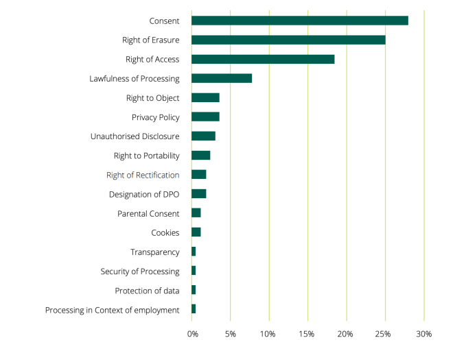 A breakdown of these (likely) tech giant focused GDPR complaints shows a strong focus on consent, right of erasure, right of access and the lawfulness of data processing: