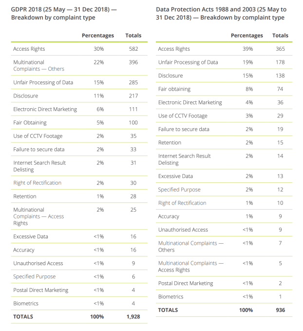 The category with the largest proportions of complaints under GDPR over the report period was access rights (30%) — with the DPC receiving a full 582 complaints related to people feeling they’re not getting their due data. Access rights was also most complained about under the prior data rules over this period.