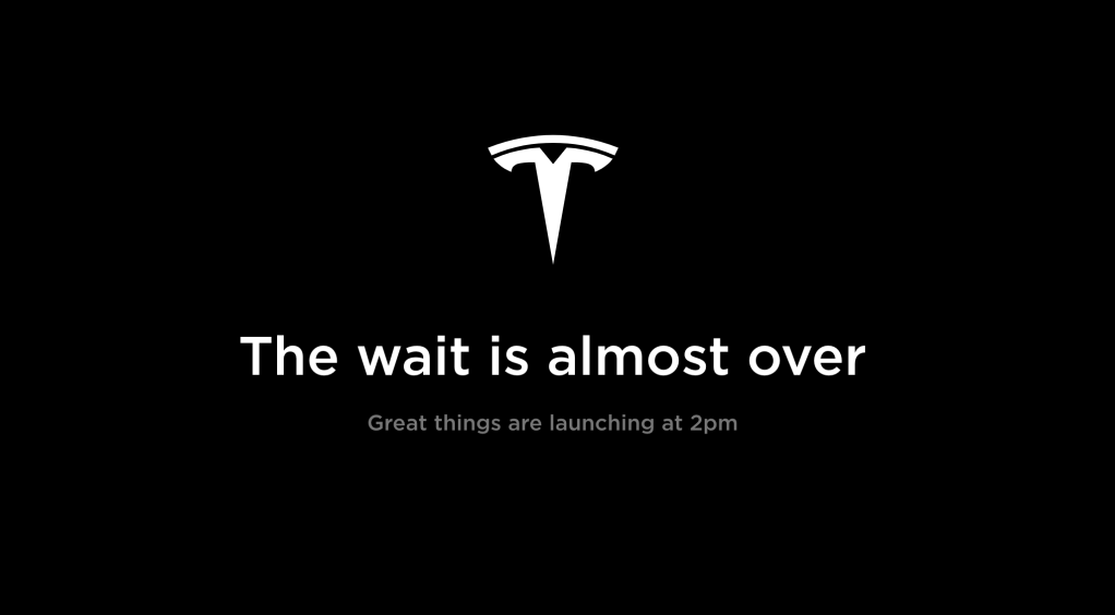 The “order” webpages for the Model 3, Model S and Model X vehicle all redirect to show a nebulous message that reads “The wait is almost over.” Below the main message, it reads “Great things are launching at 2 pm.”