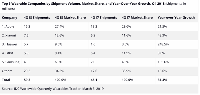 Behind Xiaomi was Huawei, which grew by a sizable 248.5 percent thanks to Huawei and Honor phones being bundled with wearables, along with other product launches. Fitbit and Samsung rounded out the top 5, with the former returning to growth thanks to the Charge 3 and promotions around its Versa, and the latter also by bundling wearables with its smartphones.