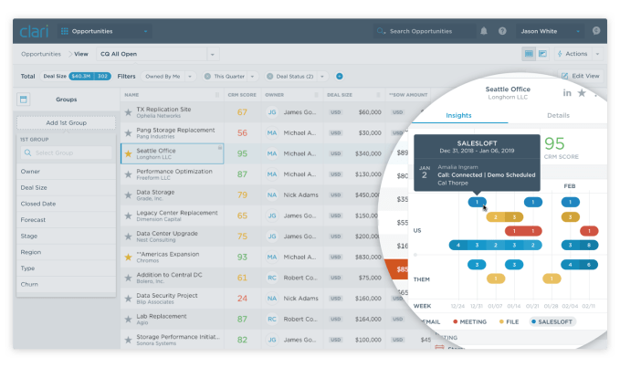 The company’s original idea when it launched in 2012 was looking at a range of data that touched the sales process, such as email, calendars and the CRM database, to bring together a broader view of sales than you could get by looking at the basic customer data stored in the CRM alone. The Clari data could tell the reps things like which deals would be most likely to close and which ones were at risk.