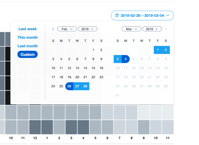 On the dashboard, the hours of the day are across the x-axis, and the days of the week are across the y-axis. The graph uses shades of gray to show which days and times video tweets see the most engagement, based on historical data.