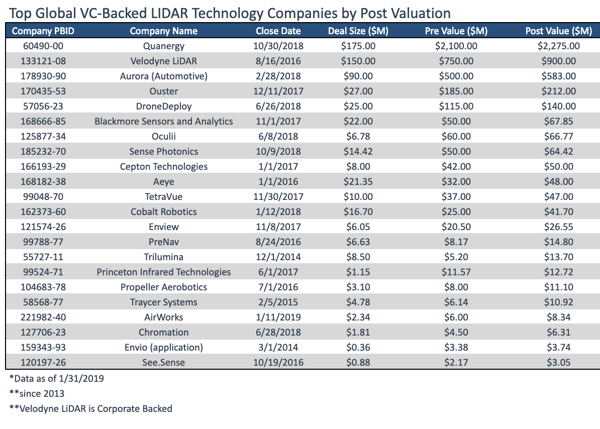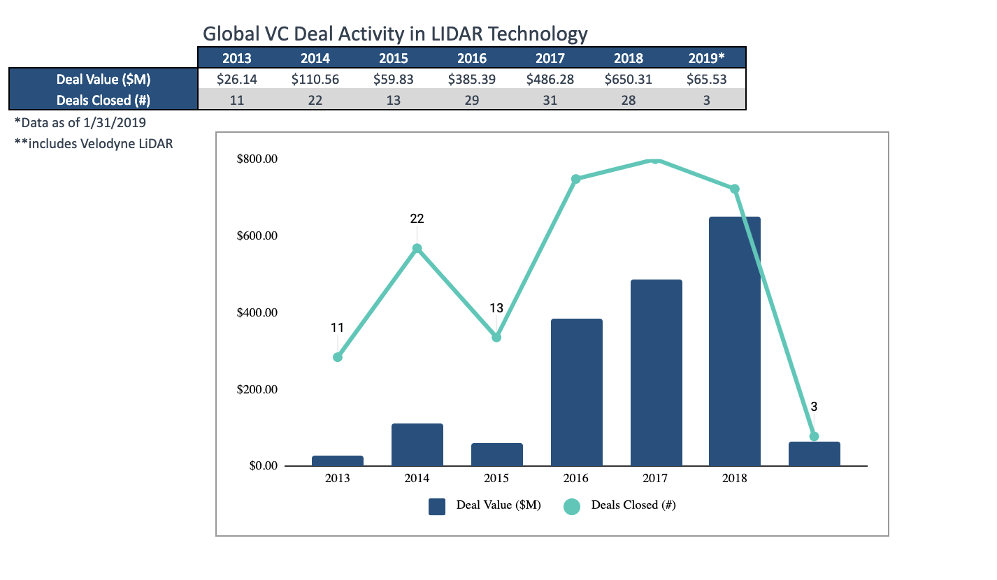 It does put pressure on startups, particularly those with less capital or those targeting the same customer base. Pitchbook ran the numbers for us to determine where the LiDAR industry sits at the moment. There are two stories here: there are a handful of well-capitalized startups, and we may have reached “peak” LiDAR. Last year, there were 28 VC deals in LiDAR technology valued at $650 million. The number of deals was slightly lower than in 2017, but the values jumped by nearly 34 percent.