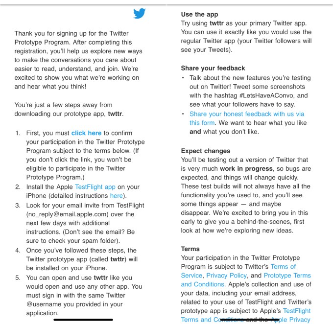 Twitter says the first group of testers will receive an email invite sometime over the next few days. Once received, users must click a link to confirm their participation, then await another email invite from Apple’s TestFlight.