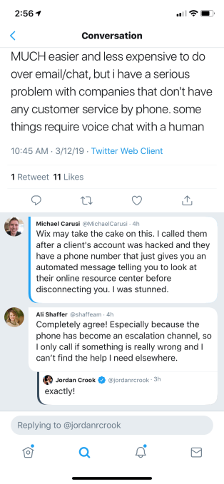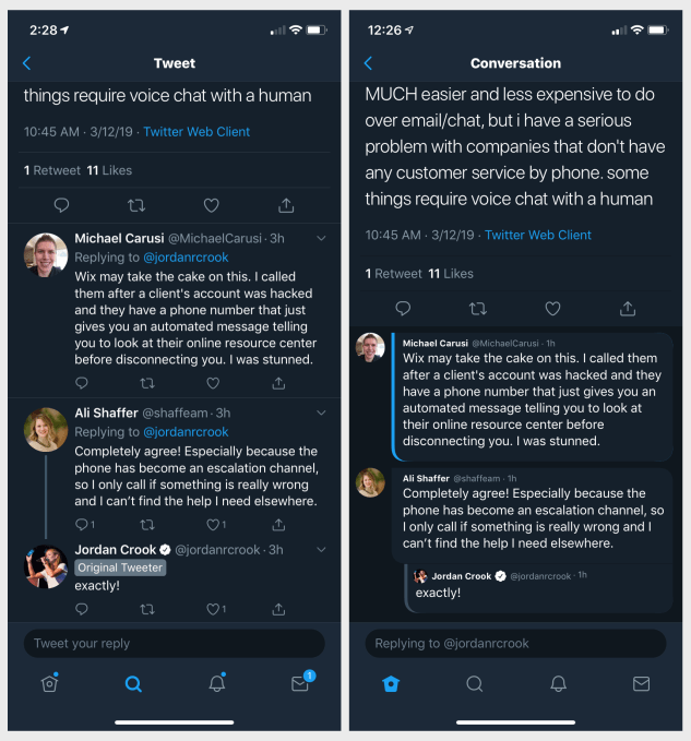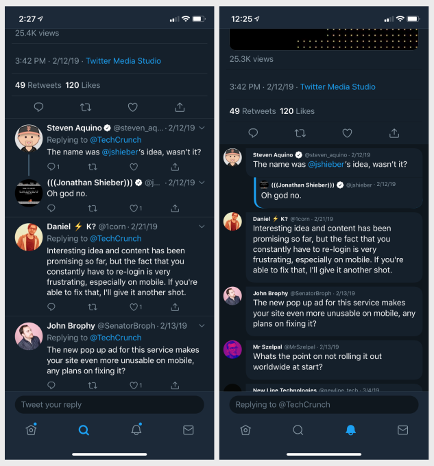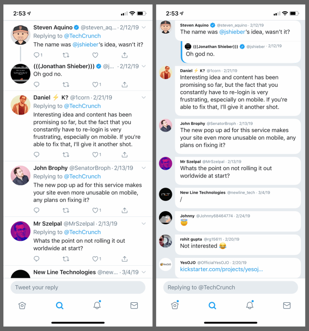 In the photo on the left, you can see how replies are handled today — a thin, gray line connects a person replying to another user within the larger conversation taking place beneath the original tweet. In the photo, TechCrunch editor Jonathan Shieber is replying both to the TechCrunch tweet and the person who tagged him in a question in their own reply to the TC tweet.