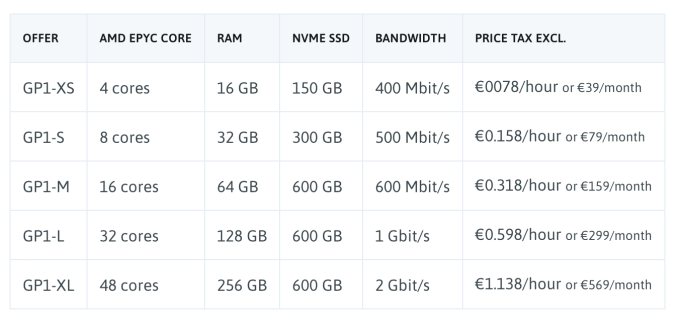 Cloud-hosting company Scaleway refreshed its lineup of high-performance instances today. These instances are now all equipped with AMD EPYC CPUs, DDR4 RAM and NVMe SSD storage. The more you pay, the more computing power, RAM, storage and bandwidth you get.