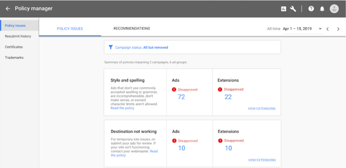 Looking ahead, the new dashboard that Google announced it would be launching next month is a self-help tool for advertisers: using machine learning, Google will scan ads before they are uploaded to the network to determine whether they violate any policies. At launch, it will look at ads, keywords and extensions across an advertiser’s account (not just the ad itself).