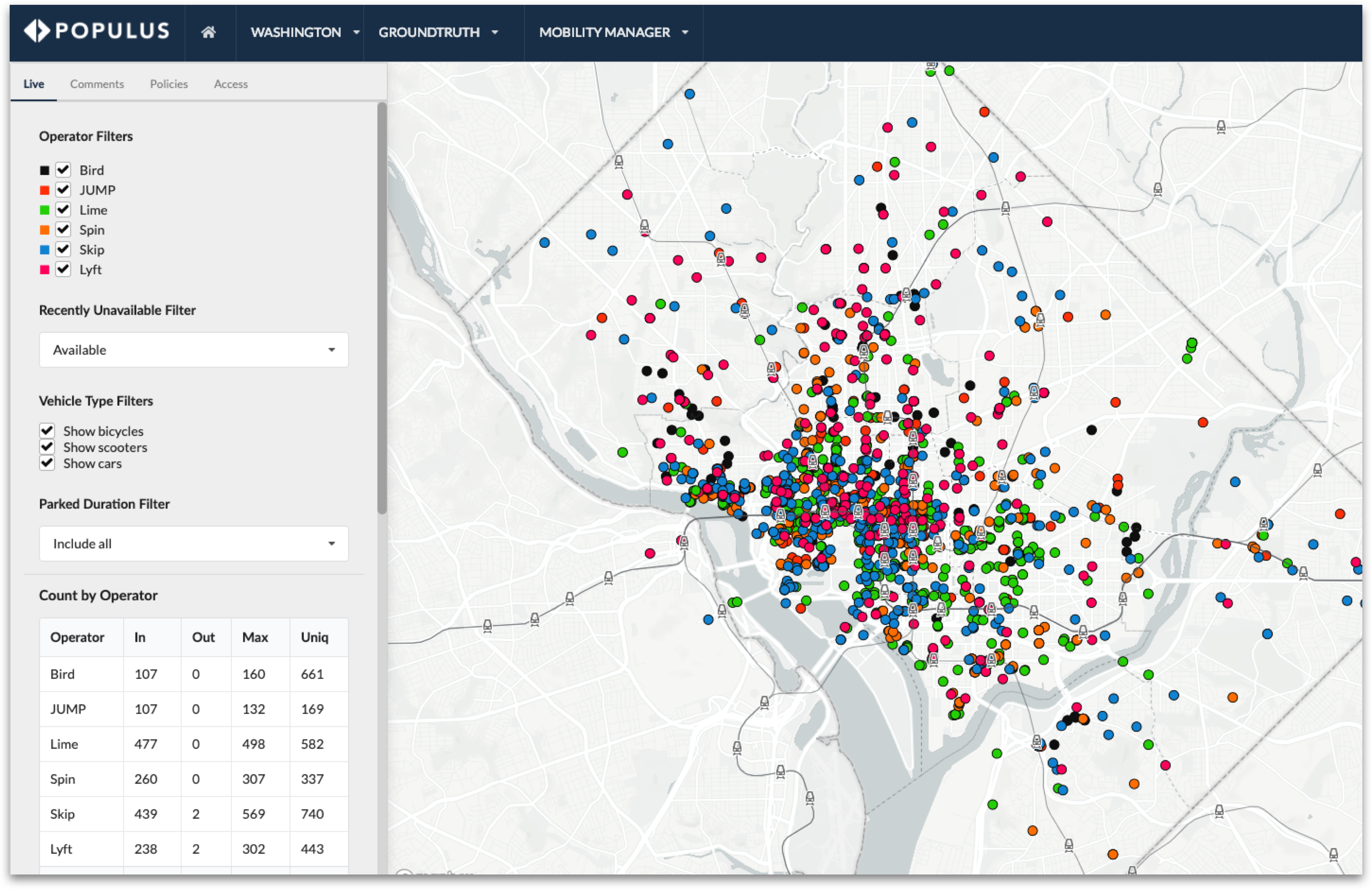 “One of the key issues that cities face around mobility services (in general), is that these services are arriving faster than most cities can keep up,” Populus CEO and co-founder Regina Clewlow told TechCrunch via email. “They are fundamentally changing transportation choices and travel patterns in ways that are unpredictable and unmeasured, making it very difficult for cities to design and manage public infrastructure (a job that only they can do). With access to better data and more importantly, information, we are finding that our customers, such as Arlington County in the D.C. area, are able to design infrastructure that can help shared mobility services grow safely and sustainably – such as new bike lanes and scooter corrals.”