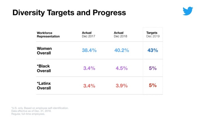 “Missing from this chart is sexual orientation and gender identity because we had lower participation in our self-ID survey for this category,” Twitter wrote in its blog post. “We believe a refresh of our self-identification efforts and a new anonymous survey will allow us to better understand and share a more accurate representation of our company moving forward. This will also put us in a position to report on representation for employees with disabilities and with military status.”
