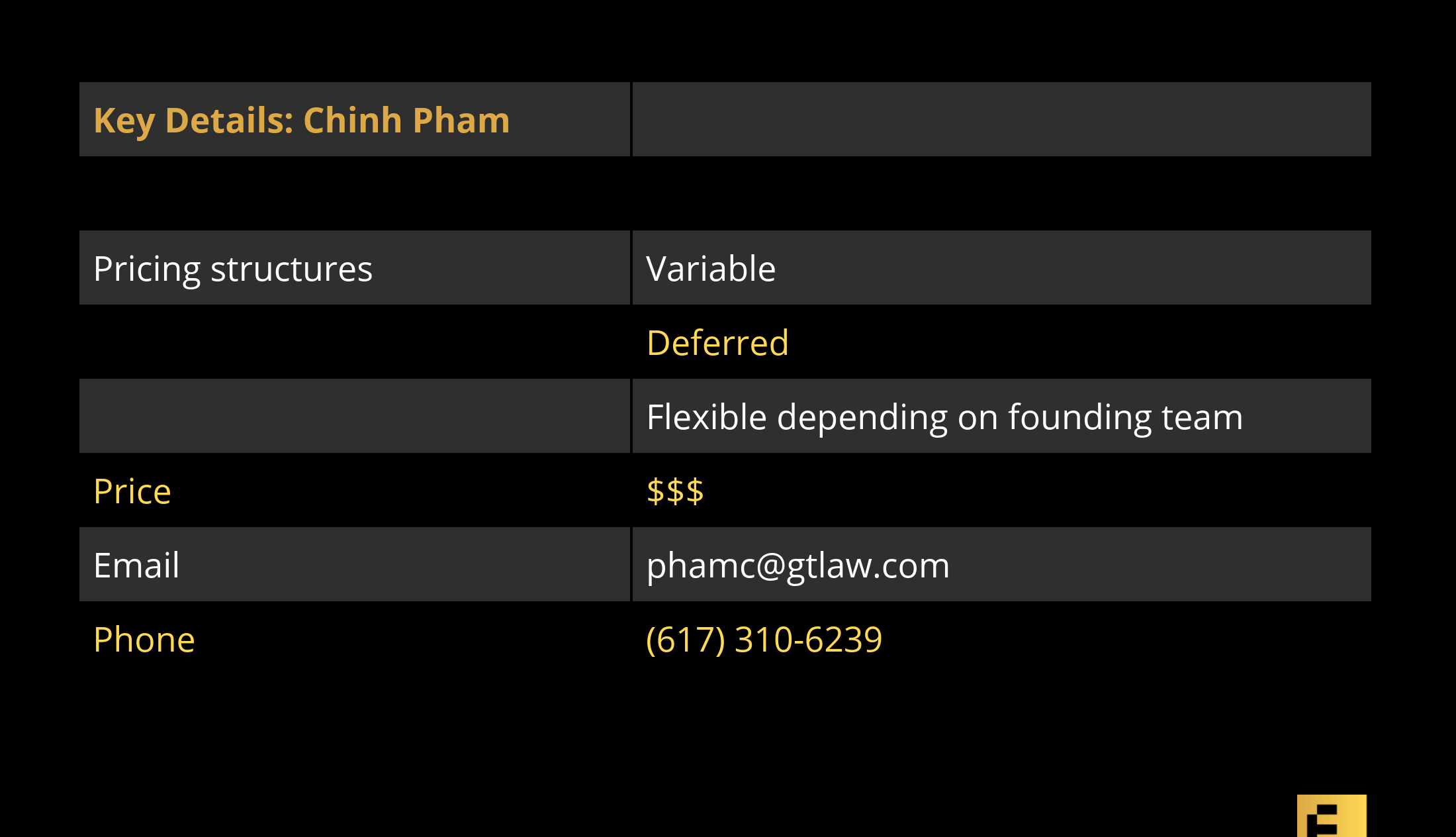 Pham: Our billing structure is not uniform across the board, because we have 39 offices and more than 100 members in the Emerging Tech Practice Group. I will say the process is fairly flexible. It’s never black and white, but we aim to do what’s best for the startup to help them succeed.