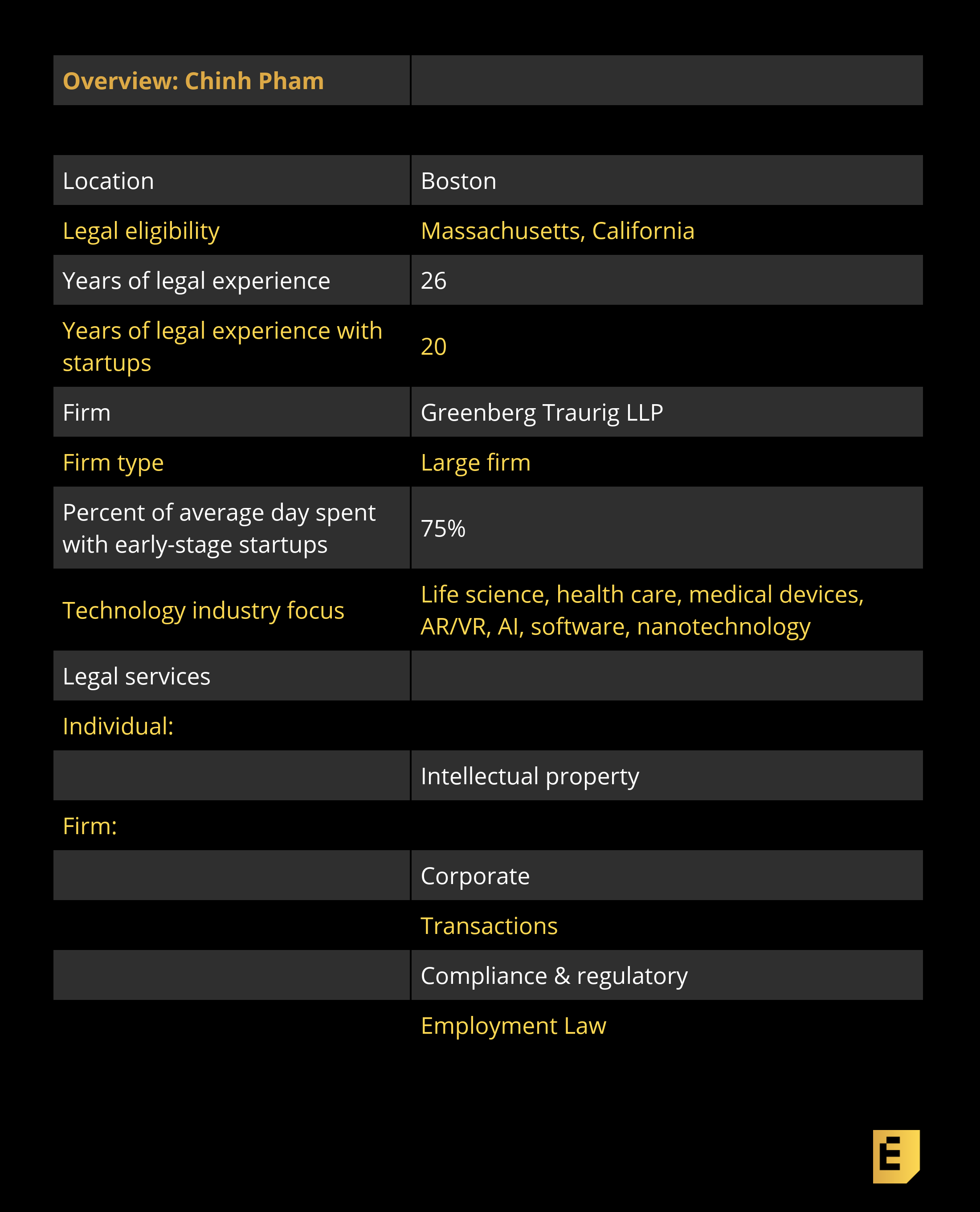 Chinh Pham got his first degree in genetics, but realized his real interest was the law as it applies to technology. Today, he combines his interests by working with a wide range of startups, including those in the life sciences, medical hardware and other industries where intellectual property defines a company from day one. As the chair of the emerging technology practice at international law firm Greenberg Traurig LLP, he and his team provide a range of services to companies from the ground floor up; he also spends significant time with commercialization programs at top universities.