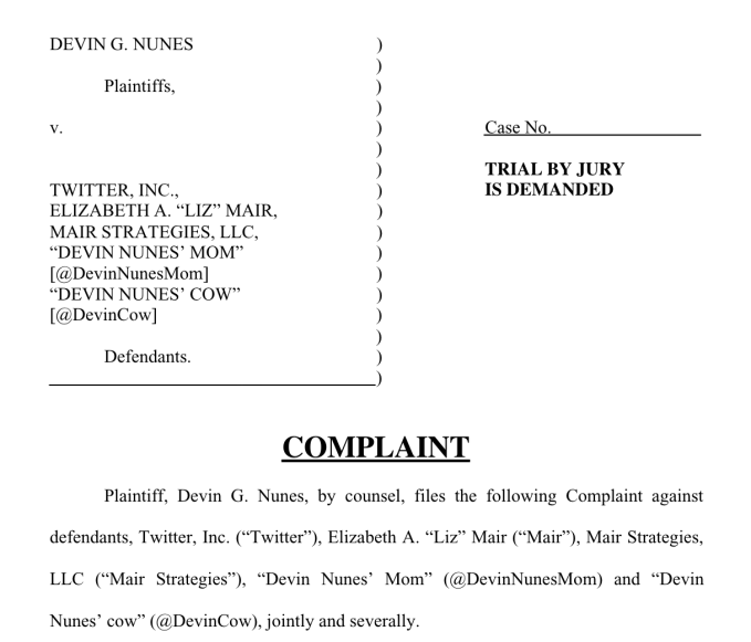 As you can see above, the complaint’s defendants include not only Twitter itself and a Nunes critic named Liz Mair but also @DevinCow and @DevinNunesMom, two accounts parodying the lawmaker’s cow and his mother, respectively.