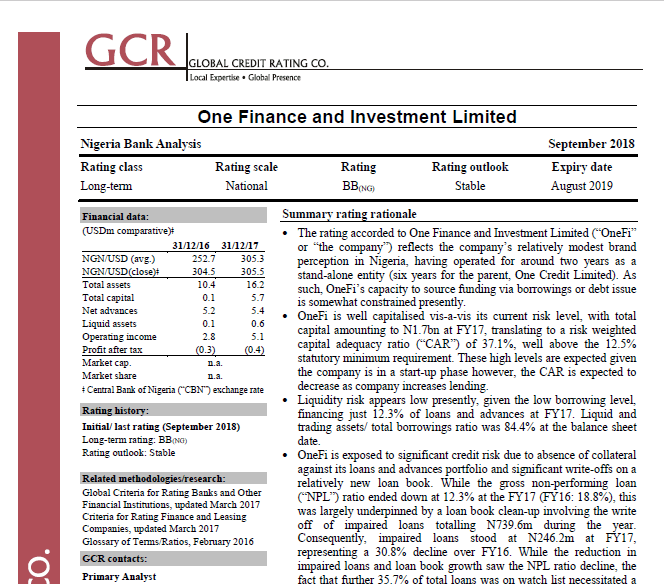 OneFi gained a BB Stable rating from Global Credit Rating Co. and showed positive operating income before taxes of $5.1 million in 2017, according to GCR’s report. Though the startup is still a private company, OneFi looks to issue a 2018 financial report in the second half of 2019, according to Dozie.