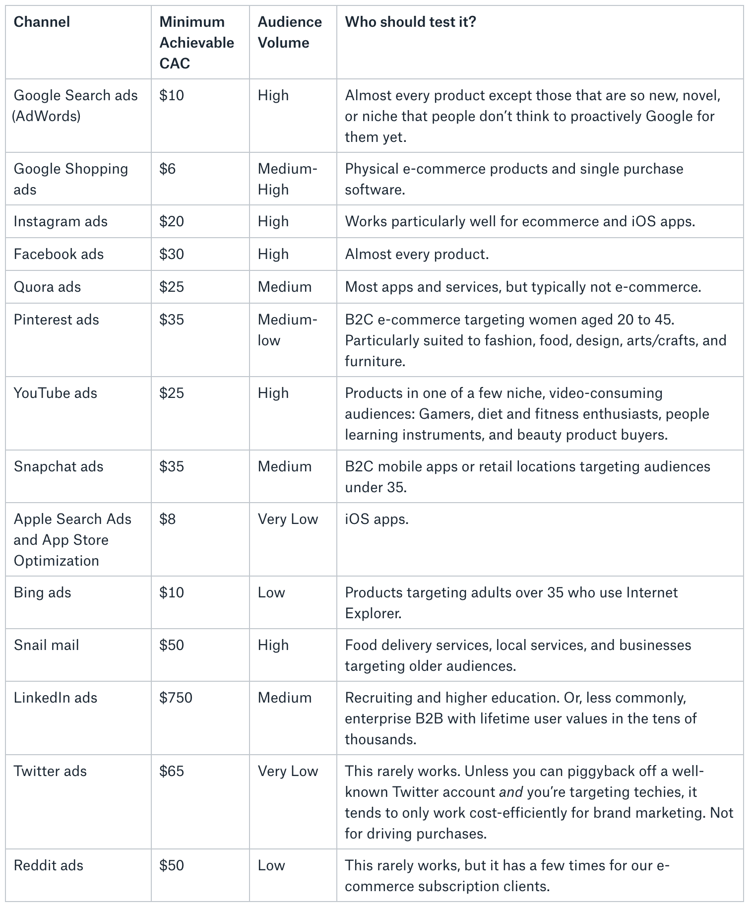 Note the minimum achievable CAC (customer acquisition cost) column. This is how much a typical business that successfully makes the ad channel work can expect to pay on average. You’ll want to compare this minimum achievable CAC figure to your own profit margins.