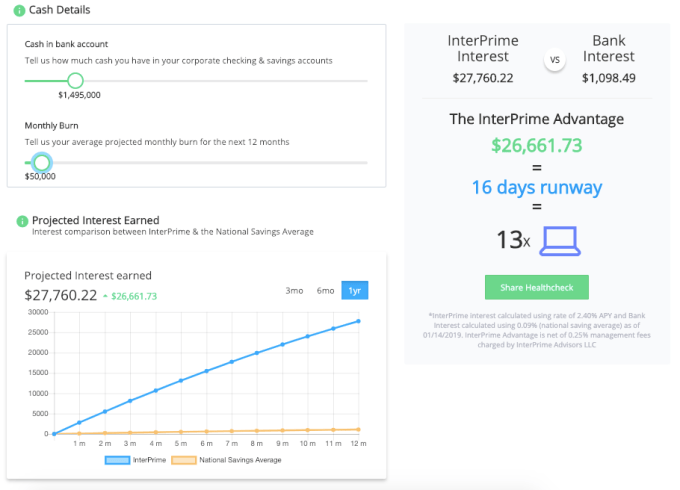 Provides “Apple level” treasury services to startups. Startups are raising a lot of money with no way to manage it, says Interprime. They want to help these businesses by managing these big investments by helping them earn interest on their funding while retaining liquidity. They take a .25 percent advisory fee for all the investment they oversee. So far, they have $10 million in investment capital they are servicing.