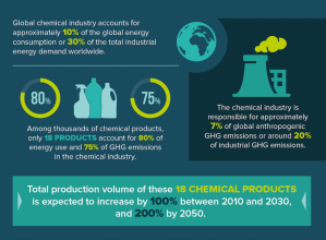 The chemicals industry is responsible for 10 percent of global energy consumption and 30 percent of industrial energy demand, while also contributing 20 percent of all industrial greenhouse gas emissions, according to the website Global Efficiency Intelligence.