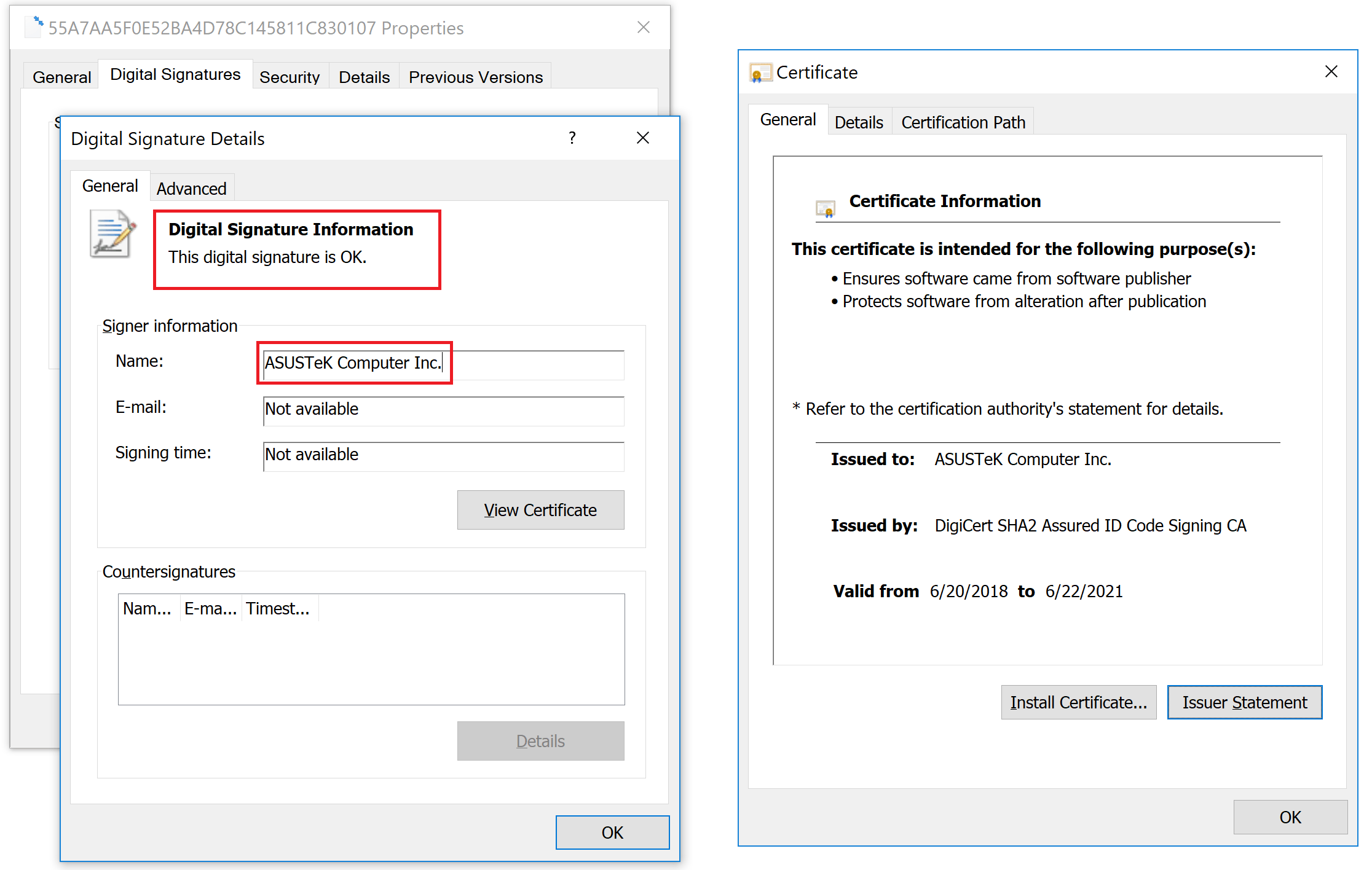One of the backdoored files used a certificate created in mid-2018 but which was different from Asus’ regularly used certificates.